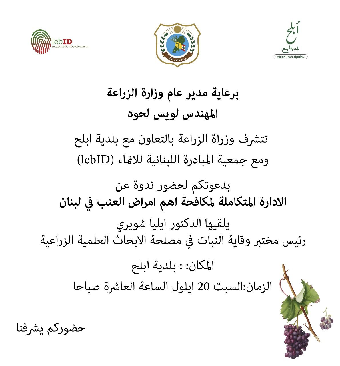 برعاية مدير عام وزارة الزراعة المهندس لويس لحود، تتشرف وزارة الزراعة بالتعاون مع بلدية ابلح ومع جمعية المبادرة اللبنانية للانماء (LebID)، بدعوتكم لحضور ندوة عن الادارة المتكاملة لمكافحة اهم امراض العنب في لبنان